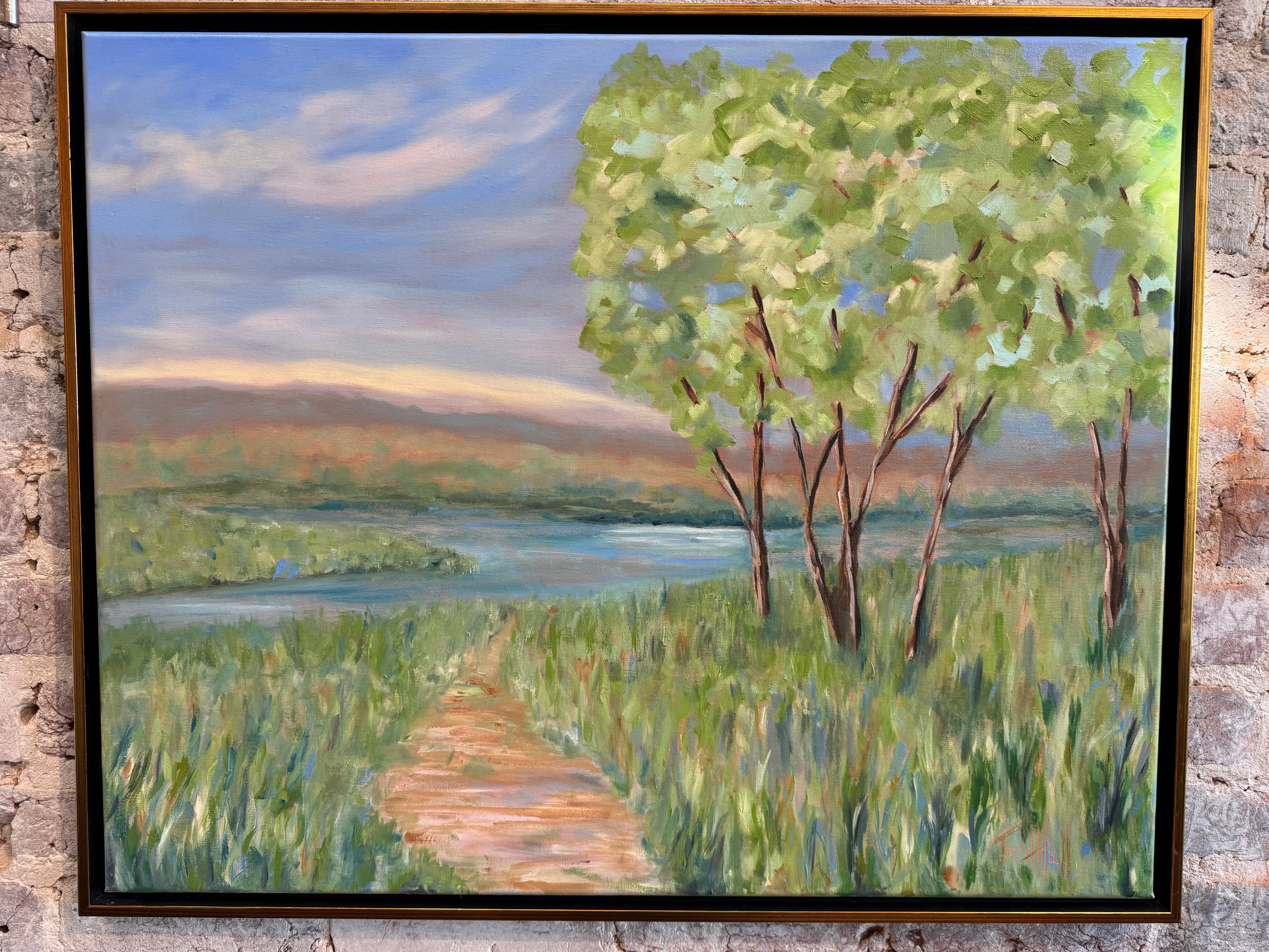 An original painting depicting tall grass and trees next to a shoreline, create on a 24x30" linen stretched canvas. It is presented in a black float frame with gold trim, measuring 32x25.6".