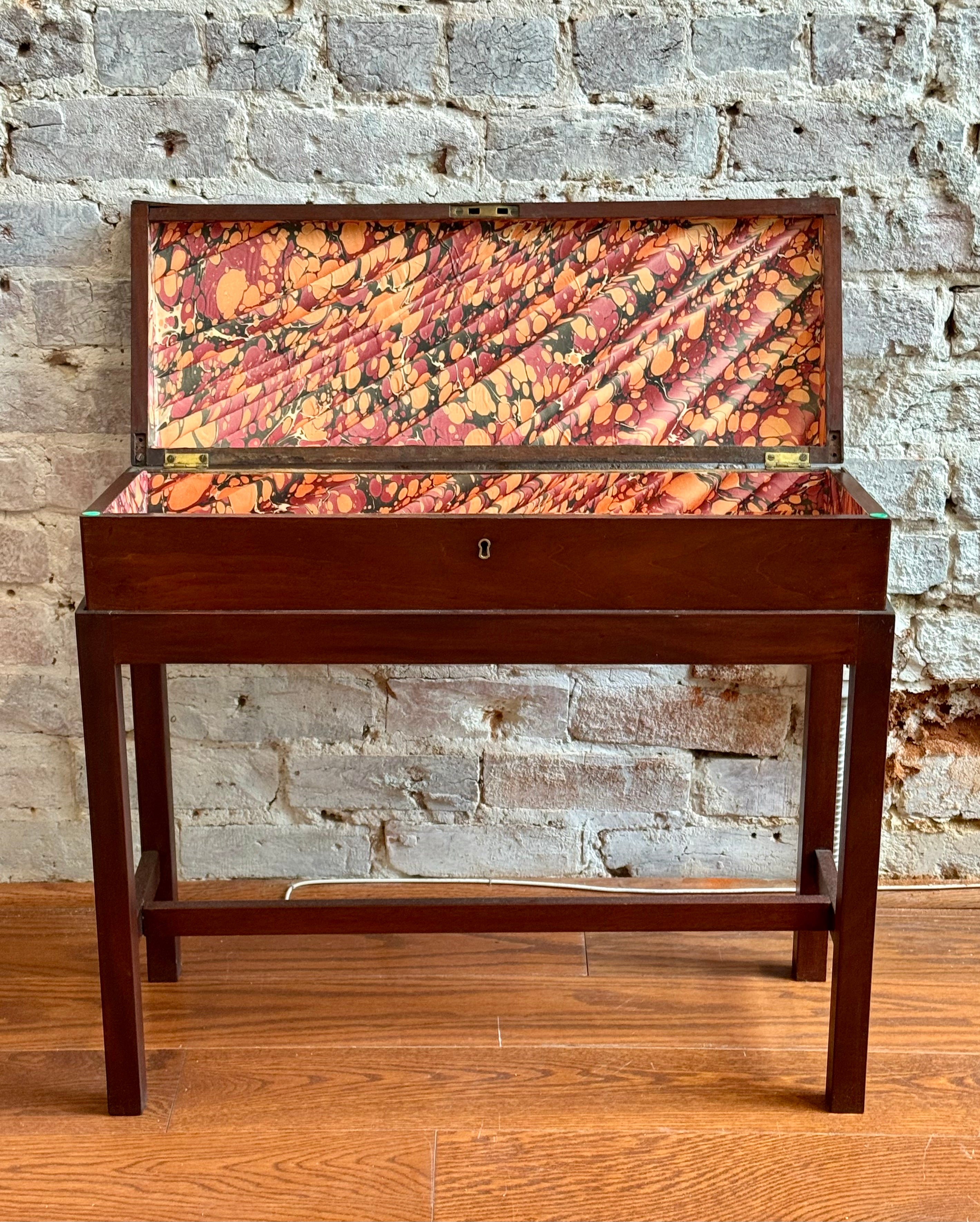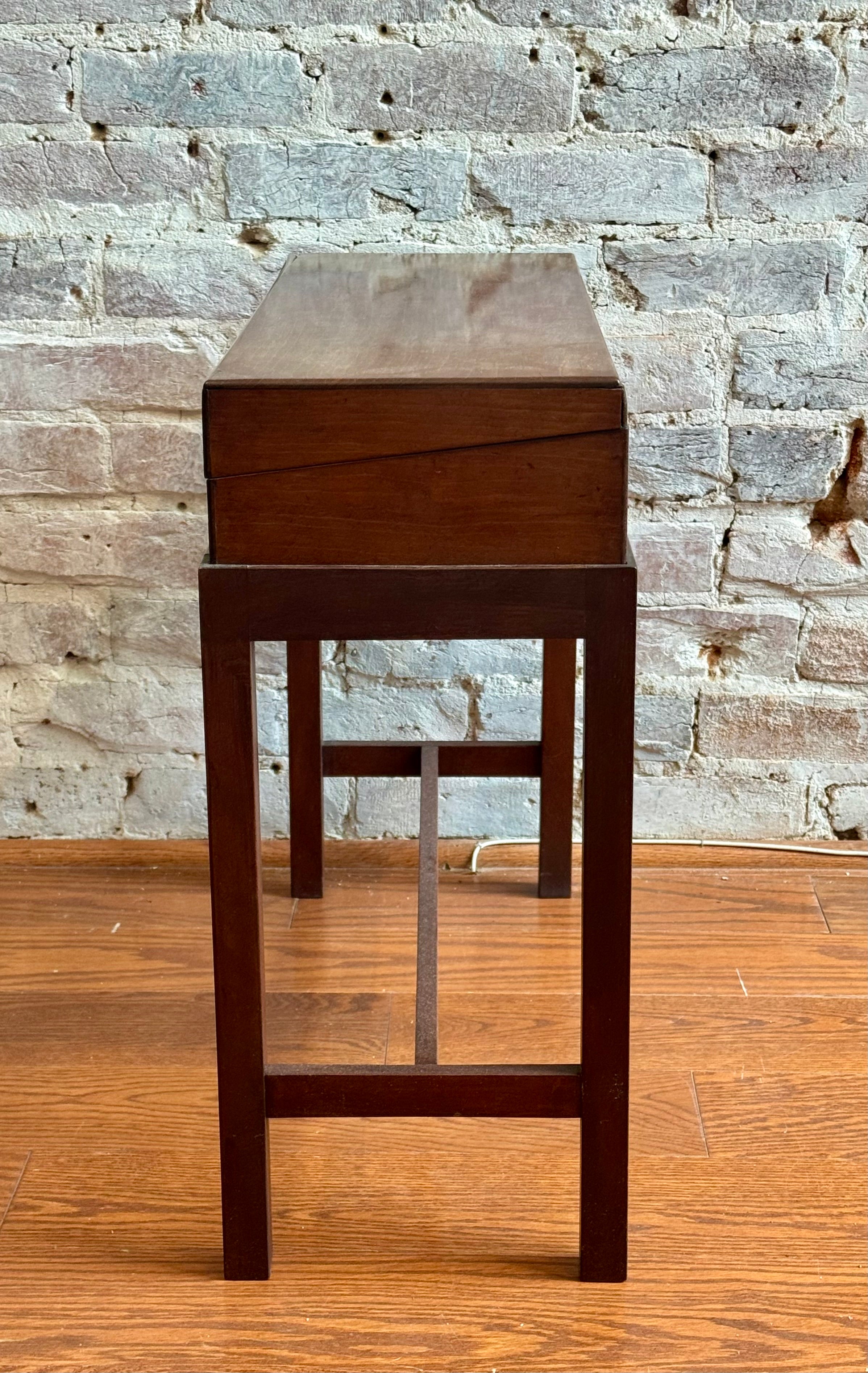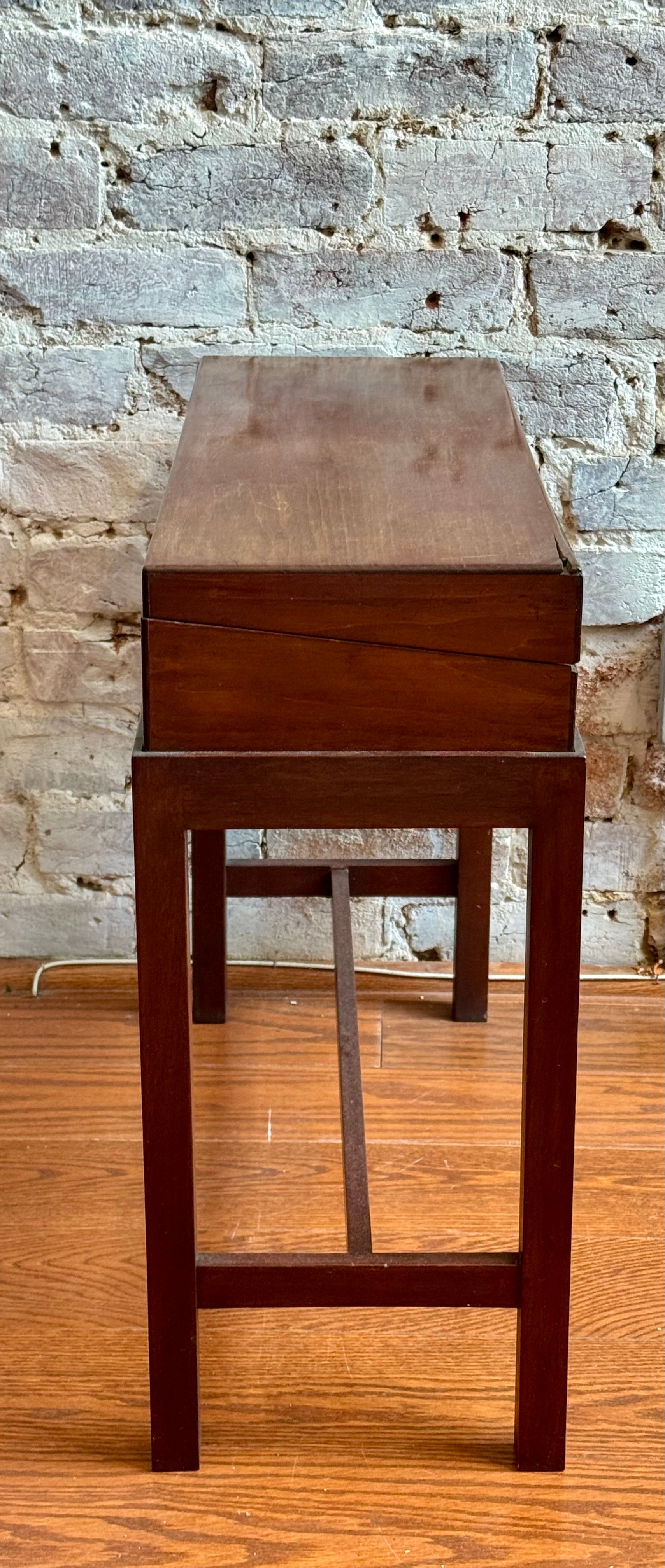Antique box on stand, lined, has wear to top please see pictures. Box measures 24.75" L x 9.25" Deep x 4.25" T, stand measures 25 3/8" L x 9.75" Deep x 18" T.