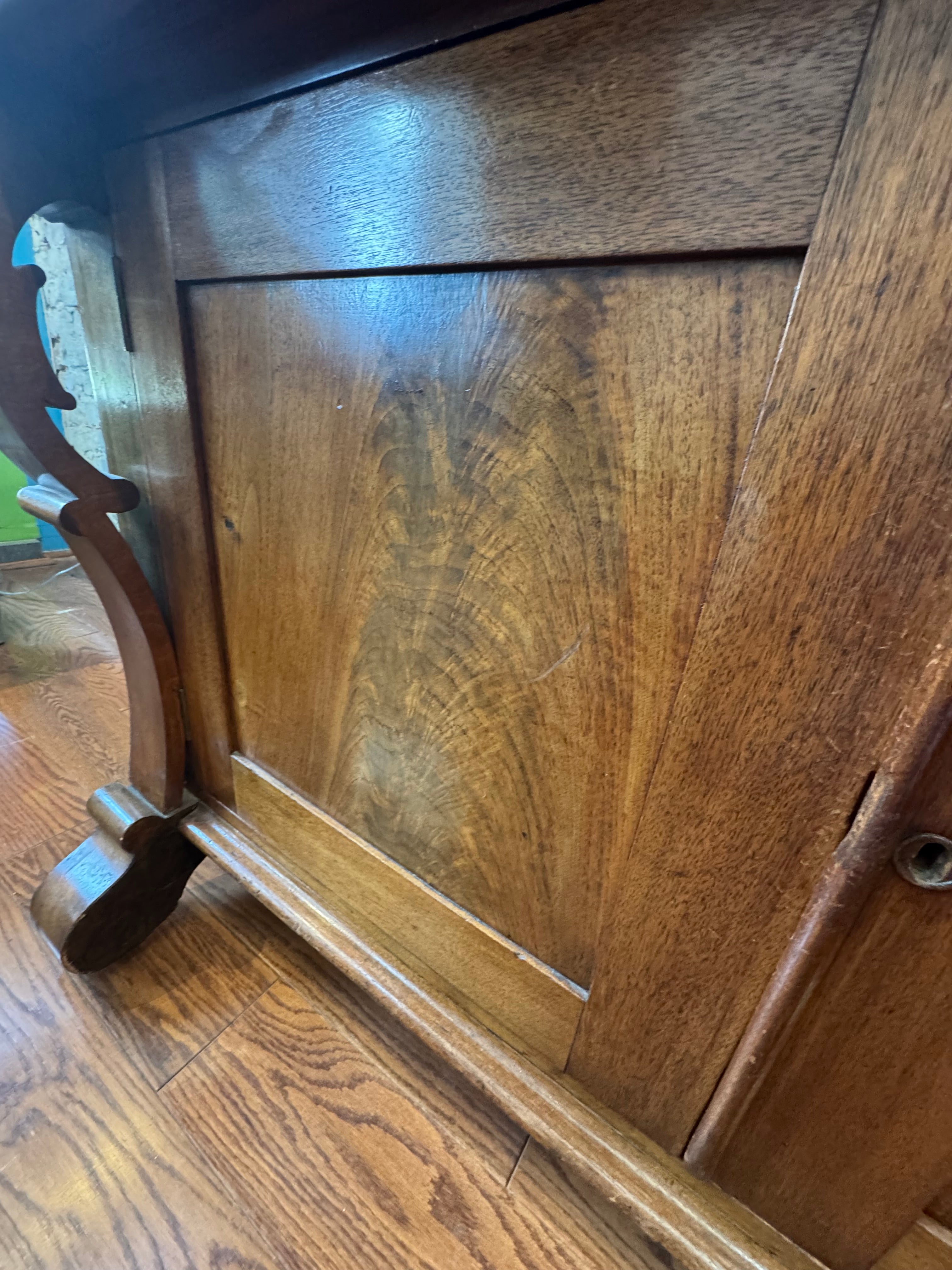 This exquisite late 1800s Empire-style secretary is crafted from rich walnut and features a two-part design for versatile use. The upper section offers ample storage with elegant drawers and compartments, while the lower part provides a smooth writing surface and additional storage space. Its stately Empire details and sturdy construction make it both a functional workspace and a distinguished antique centerpiece. Ideal for collectors or those seeking a refined blend of history and practicality in their interiors.