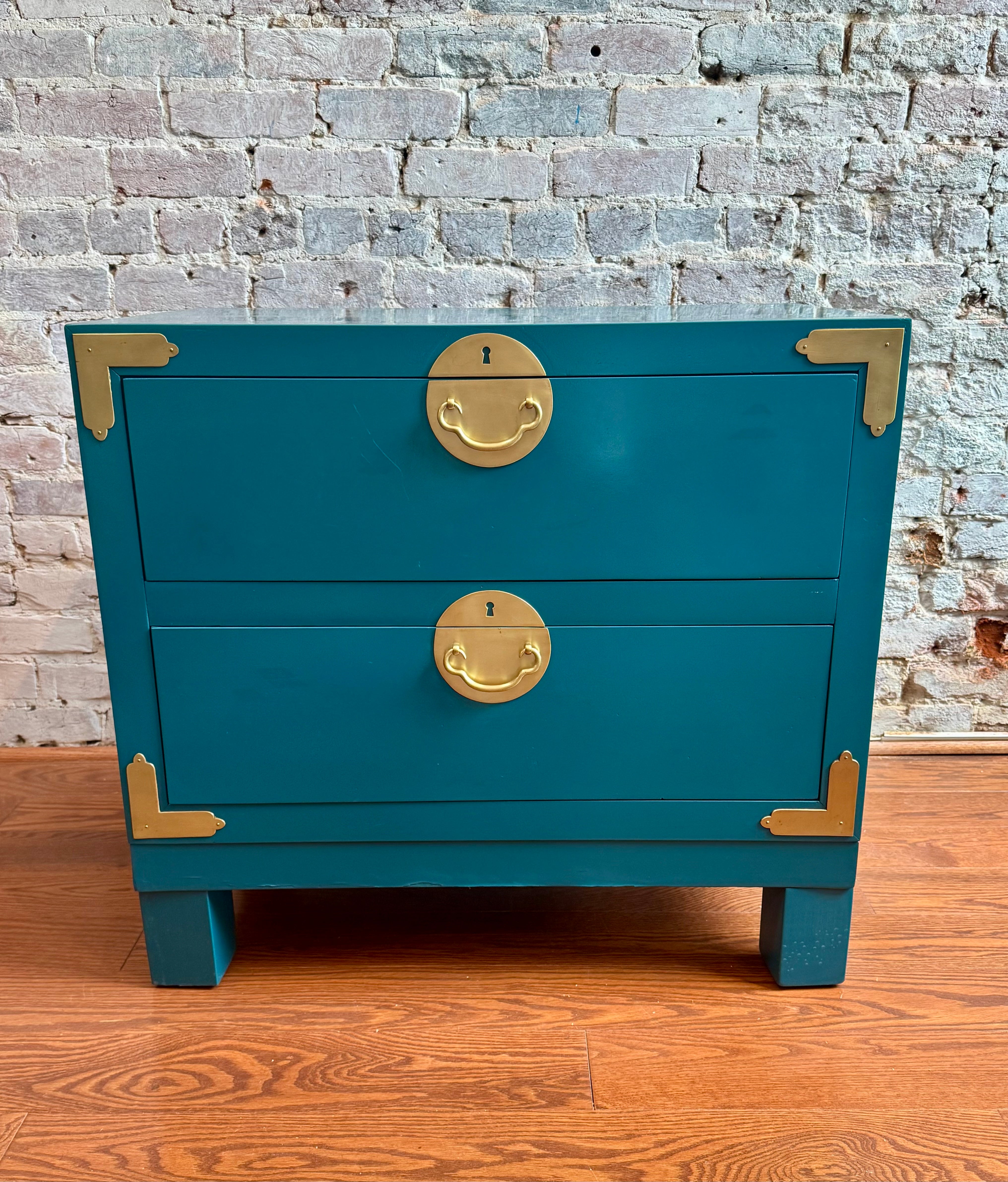 Chic and timeless, the Vintage Lacquered Chest boasts a rich, dark teal color and brass hardware for an exquisite touch. With two spacious drawers, this chest is both sleek and functional, perfect for adding a touch of elegance to any living space. Measures 31.75" wide x 29.25" tall x 20" deep. ***In-store pickup only or buyer may arrange shipping***