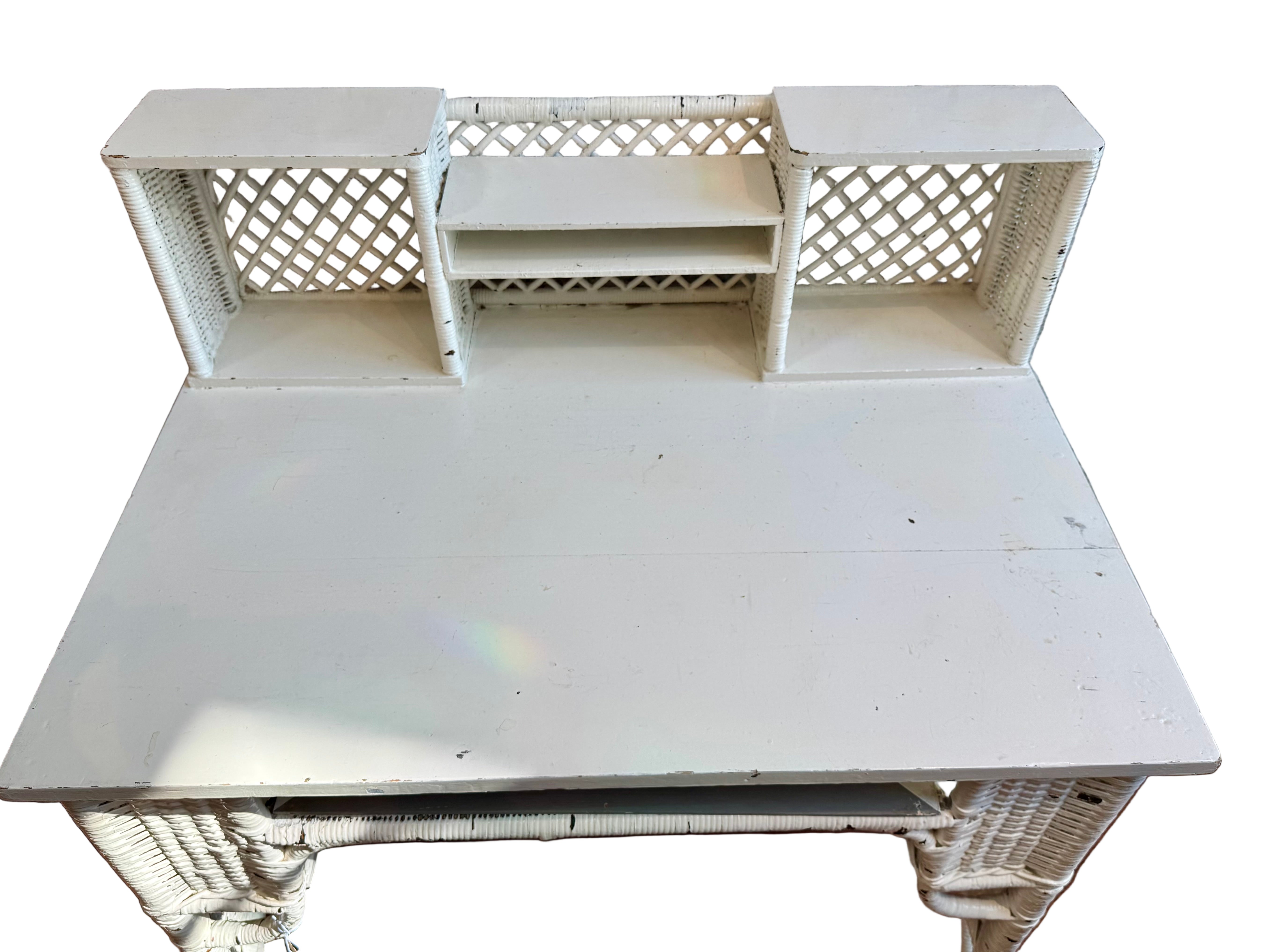 This elegant 29 "tall x 36" wide x 24" deep antique white wicker writing desk combines timeless charm with practical design. Its delicate wicker craftsmanship adds a refined texture, while the compact size fits perfectly in any sophisticated workspace or cozy corner. Ideal for writing or light tasks, this desk brings a graceful vintage touch to your interior.