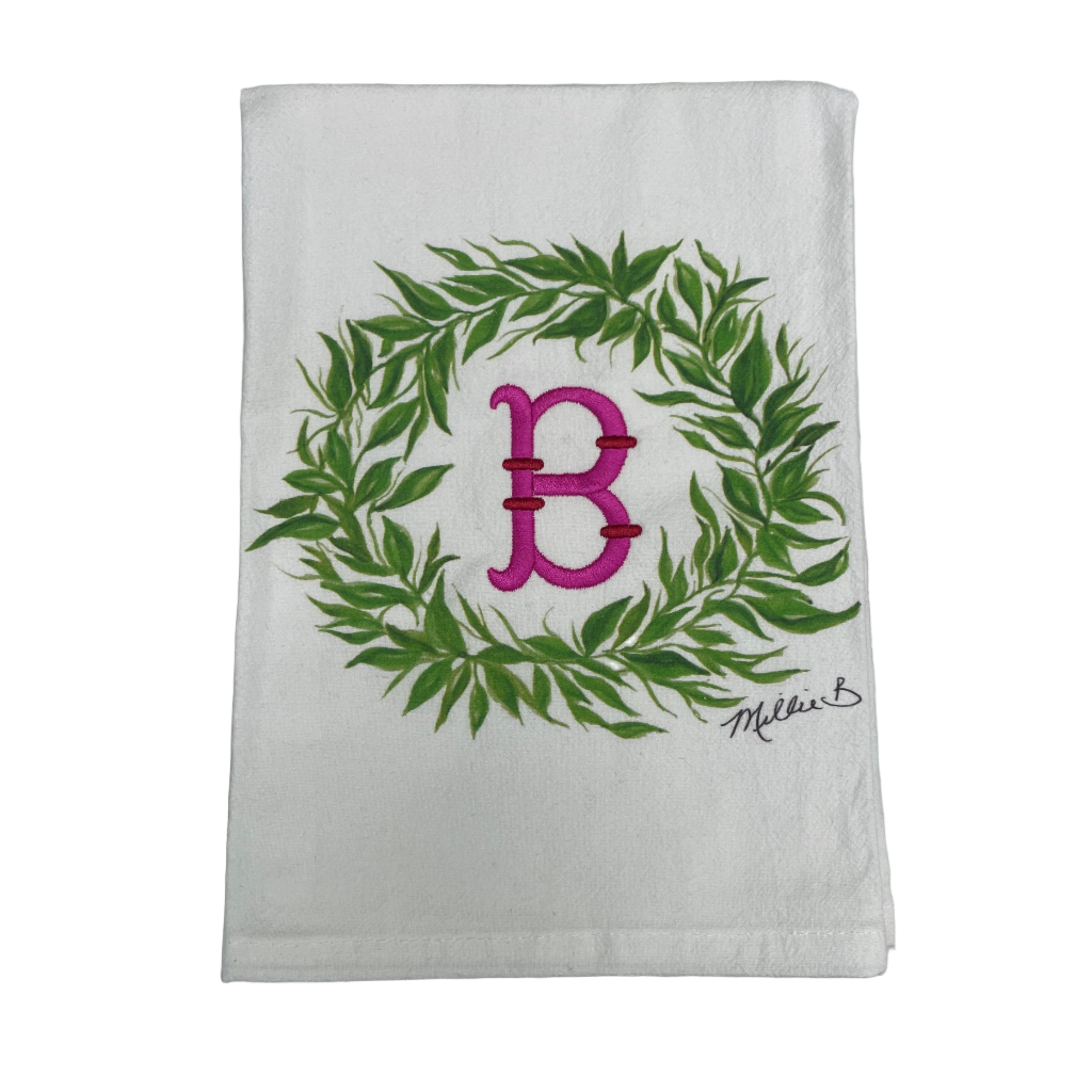 Elevate your seasonal décor with this charming monogrammed tea towel, featuring a delicate green leaf wreath design accented with hot pink. Crafted on premium flour sack fabric, this piece brings a refined, farmhouse-inspired aesthetic to any room. The personalized "B" monogram adds an intimate touch, making it perfect for home displays or as a thoughtful gift. Its timeless appeal complements both traditional and contemporary interiors with understated elegance.