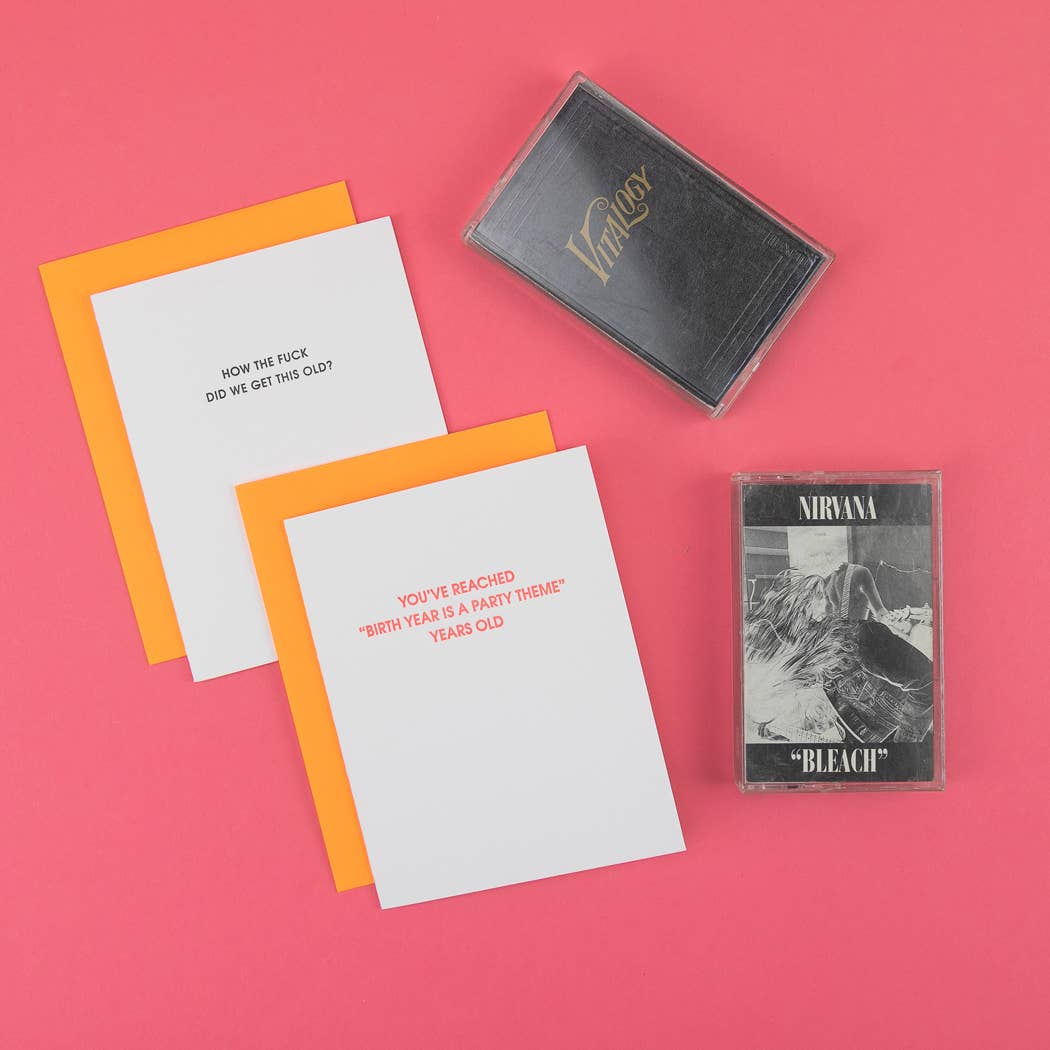 Our "how the fuck did we get this old" card is letterpress printed on a vintage printing press.  Paper: Bright white, tree-free 100% cotton paper. Ink:  Black. Envelope: Orange. Size: 4.25" x 5.5". Folded card, blank inside. Sealed in a cello sleeve.