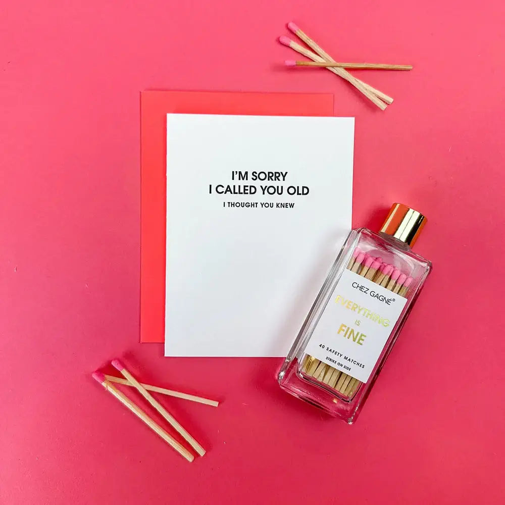 Our "I'm Sorry I Called You Old" Card is a letterpress printed on a vintage printing press in sunny California. Paper: Bright White, tree-free 100% cotton paper. Ink:  Black. Envelope: Red. Size: 4.25" x 5.5". Folded card, blank inside. Sealed in a cello sleeve.