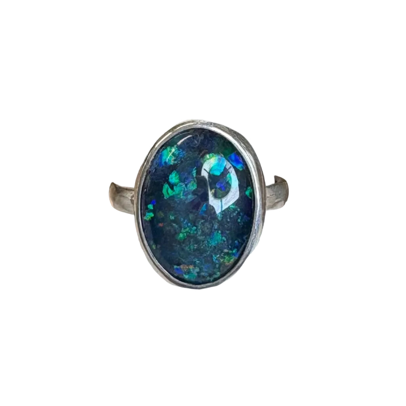 This Black Opal Ring Striking black opal takes center stage in this handcrafted sterling silver ring, commanding attention with its bold, iridescent play of color. The substantial 2.9 cm face showcases the stone's natural depth and mystery, while the 3 cm diameter ensures a confident presence on your hand. Each piece is individually made, capturing the raw elegance of genuine opal set in lustrous sterling. Perfect for those who refuse to blend in—a statement ring that whispers of sophistication and dares to be different.
