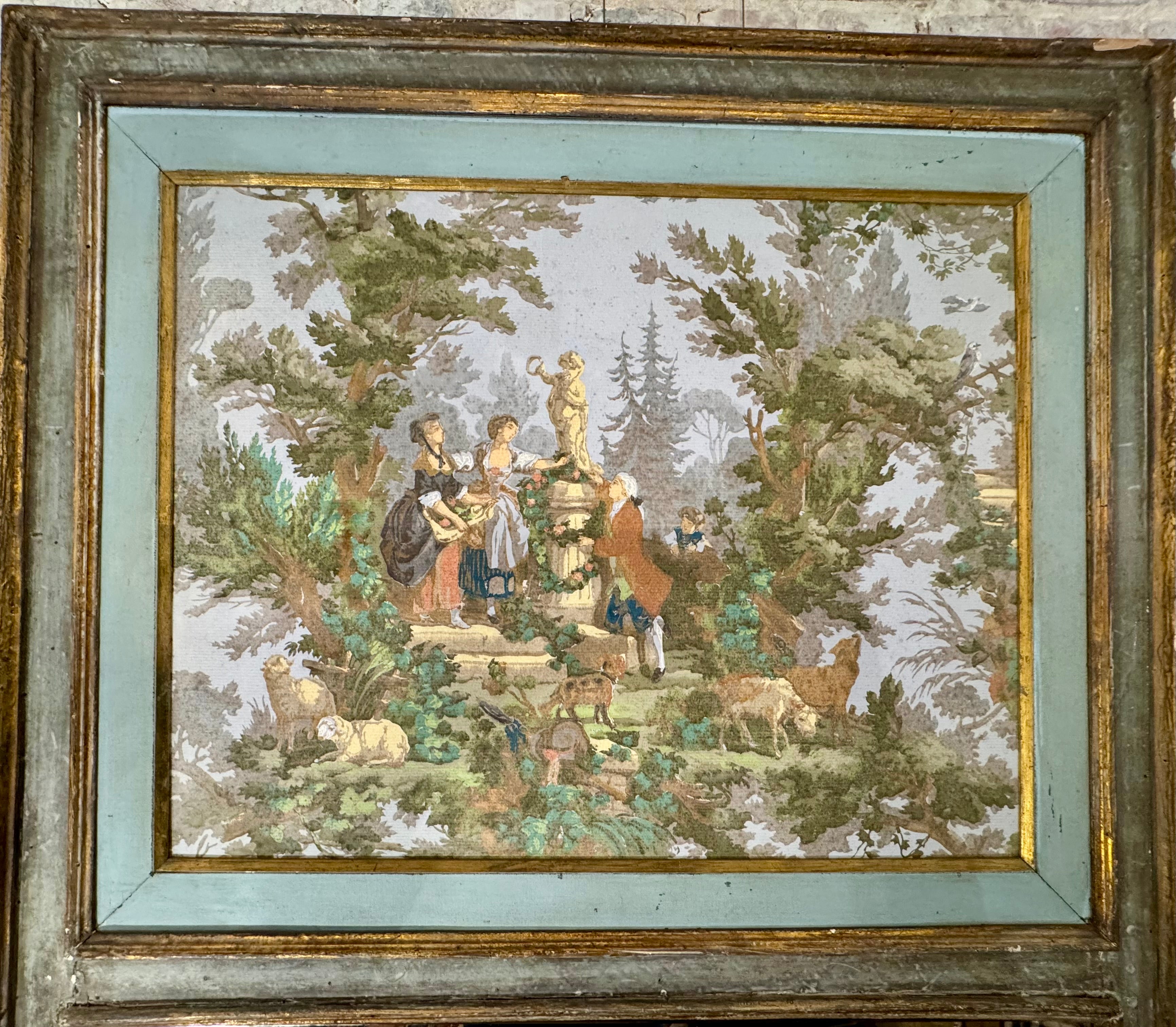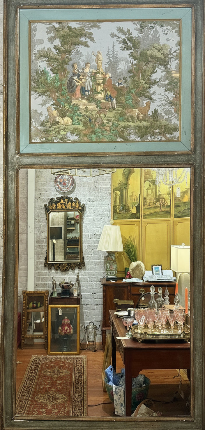 This Antique 19th century French Trumeau would be perfect in a dining room, living room, foyer or bedroom. There is a French painting at the top of the Trumeau with glass underneath.