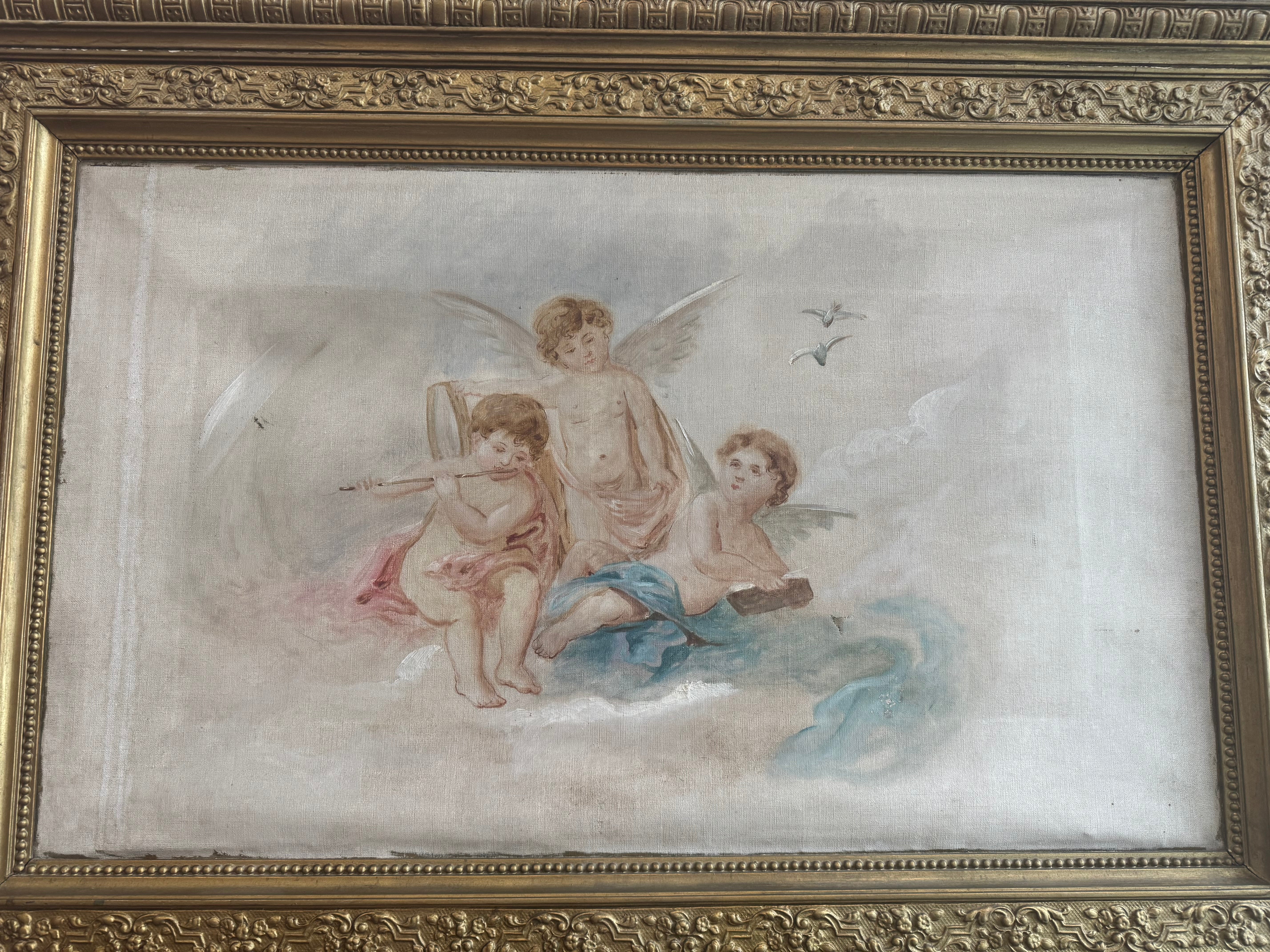 This 19th Century antique French gold gilt Trumeau would look absolutely beautiful in a foyer, dining room, sitting room or bedroom. At the top of the Trumeau there is an antique painting of cherubs and beveled glass underneath.