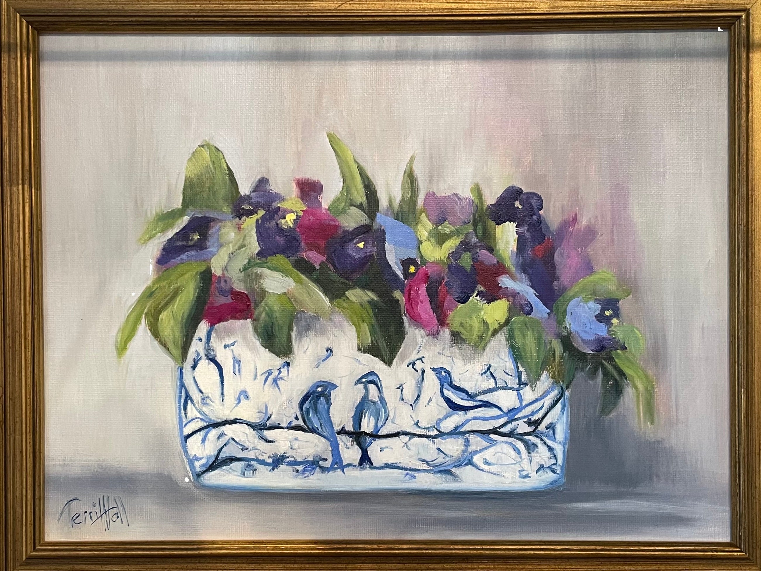 This original oil painting on a linen flat panel by Terri Hall, titled "Floral In Delft - A Painted Afternoon," showcases timeless elegance and refined artistry. Its delicate floral composition, rendered with expert brushwork, brings a serene and sophisticated ambiance to any interior. Perfect for collectors or those seeking a unique statement piece, this artwork combines classic inspiration with contemporary craftsmanship. Painting measure 11" x 14" and set in a gold-tone frame sized 16.25" x 13>25". Varnished and ready to display.